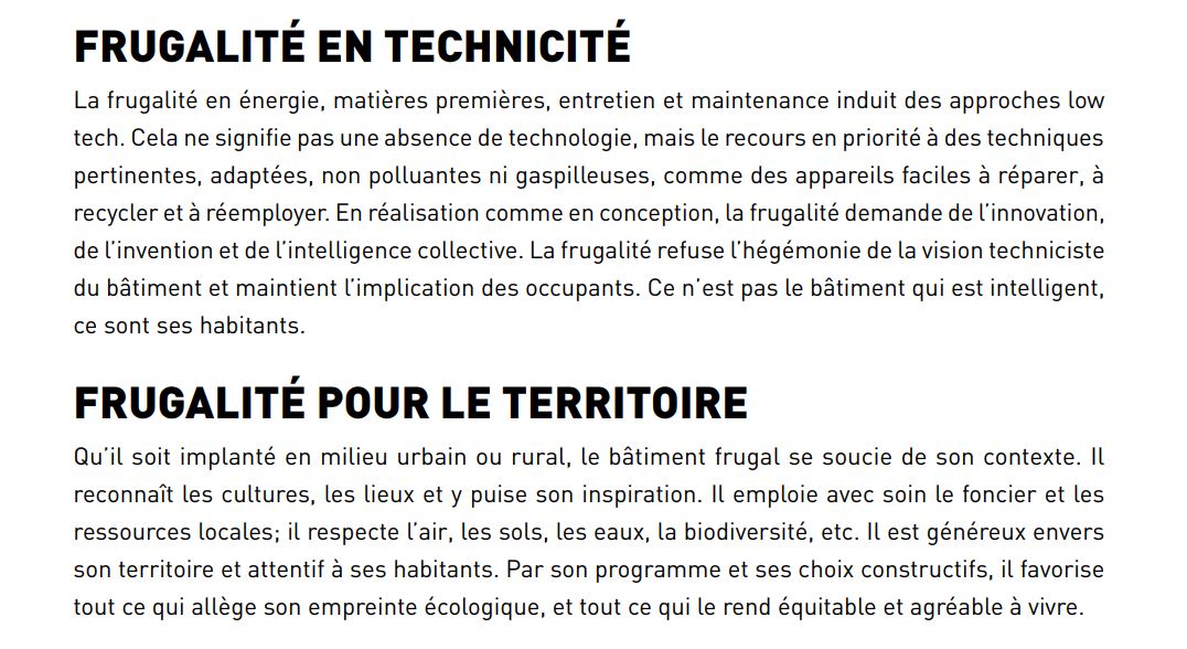 Le manifeste pour une frugalité heureuse est une initiative par l’architecte Dominique Gauzin Muller, l’architecte-urbaniste Philippe Madec et l’ingénieur Alain Bornarel.
